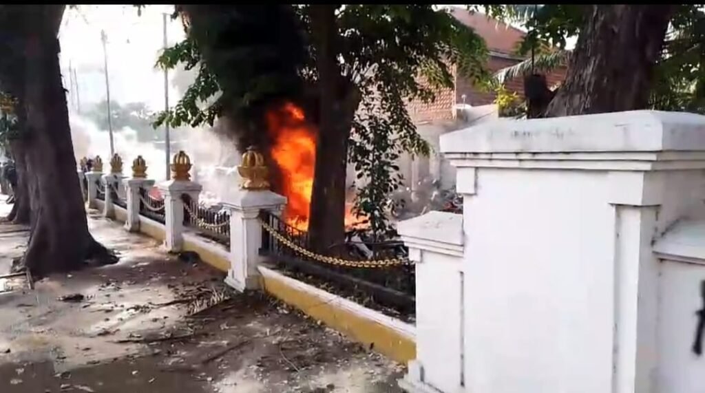 Api sempat berkobar dan membakar sejumlah sepeda motor yang terparkir di sekitar pagar. Asap hitam pekat terlihat membumbung tinggi.