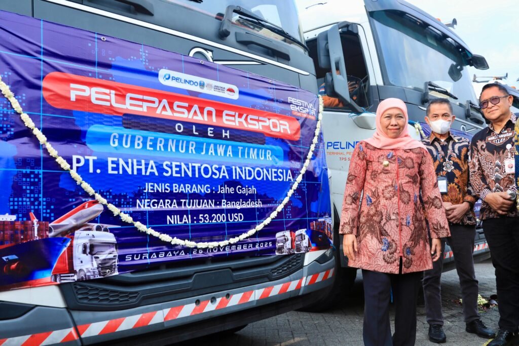 SURABAYA, 27 NOVEMBER 2025 – VNNMedia – Gubernur Jawa Timur Khofifah Indar Parawansa melepas enam truk produk ekspor Industri Kecil Menengah (IKM) Desa Devisa Jawa Timur dengan nilai total USD351,6 ribu atau setara Rp5,8 miliar. Pelepasan dilakukan dalam gelaran Festival Ekspor Jawa Timur 2025 di PT Terminal Petikemas Surabaya (TPS), Rabu (26/11/2025).