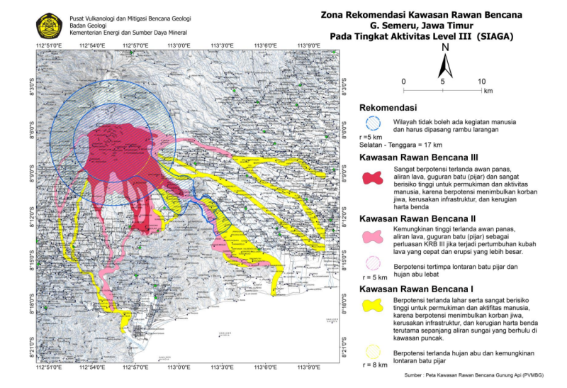 Sementara itu, Gunung Semeru dengan status Level III (Siaga) memiliki KRB III radius 5 kilometer dengan perluasan ke arah selatan–tenggara hingga 17 kilometer, KRB II sejauh 5 kilometer, serta KRB I hingga 8 kilometer.