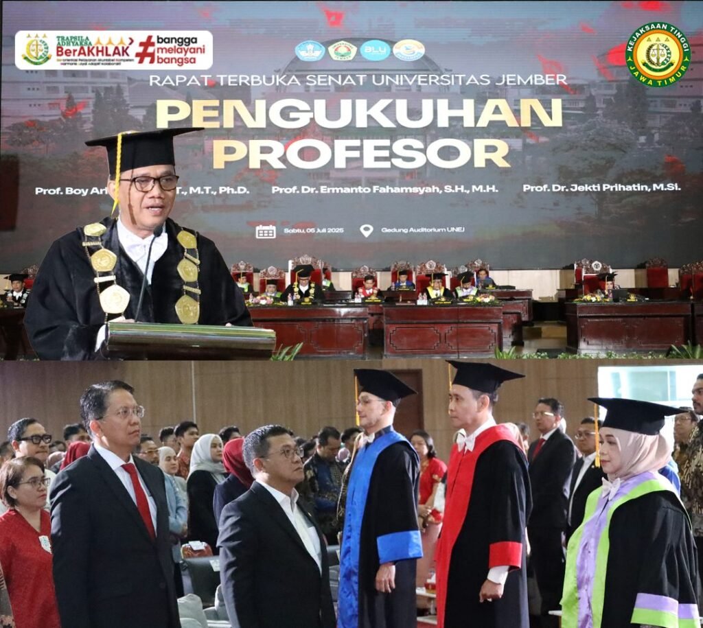 Acara ini turut dihadiri jajaran pimpinan Universitas Jember, pejabat pemerintah daerah, civitas akademika, serta tamu undangan dari berbagai instansi. Kegiatan berlangsung khidmat dan penuh apresiasi atas dedikasi para Guru Besar baru dalam mengembangkan ilmu pengetahuan dan mendukung kemajuan pendidikan di Indonesia.