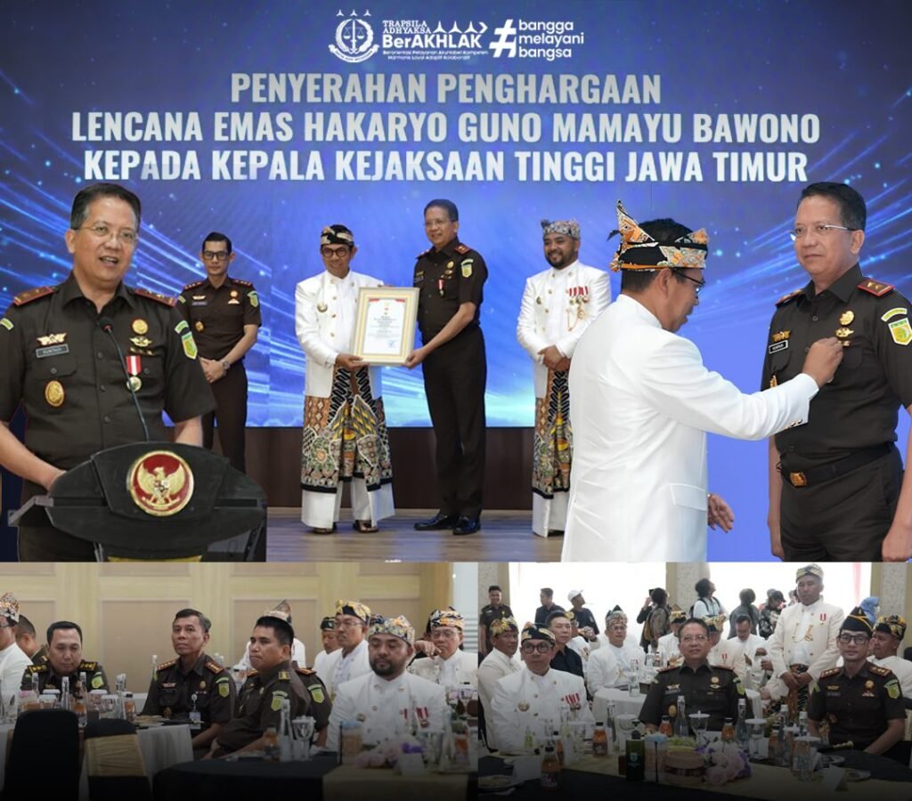 Batu, Sabtu 18 Oktober 2025 – VNNMedia – Dedikasi dan kontribusi Kepala Kejaksaan Tinggi Jawa Timur, Dr. Kuntadi, S.H., M.H., dalam menegakkan hukum dan menyelamatkan aset publik kembali menuai apresiasi. Atas kinerja tersebut, Pemerintah Kota Batu menganugerahkan penghargaan Lencana Emas “Hakaryo Guno Mamayu Bawono” kepada Kajati Jatim di Graha Pancasila, Balai Kota Among Tani, Kota Batu, pada Jumat (17/10/2025).