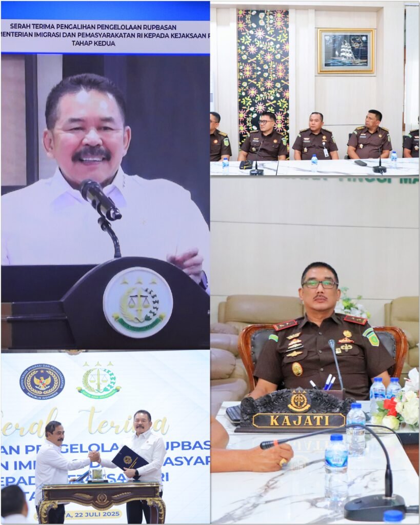 AMBON, Rabu 23 Juli 2025 – VNNMedia – Pengalihan pengelolaan Rumah Penyimpanan Benda Sitaan Negara (RUPBASAN) tahap II dari Kementerian Imigrasi dan Pemasyarakatan Republik Indonesia ke Kejaksaan Republik Indonesia, secara Virtual dihadiri oleh Kepala Kejaksaan Tinggi Maluku Agoes Soenanto Prasetyo, S.H.,M.H beserta jajaran melalui sarana Zoom Meeting diruang Vicon Kejaksaan Tinggi Maluku, pada hari ini Selasa (22/07/2025).