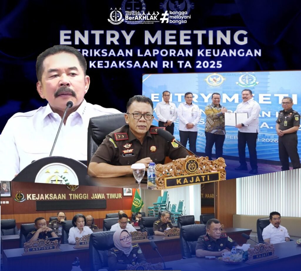 SURABAYA, Kamis 05 Februari 2026 – VNNMedia – Kepala Kejaksaan Tinggi Jawa Timur Agus Sahat ST, S.H., M.H., bersama Wakajati, para Asisten, dan jajaran Pemeriksa pada Bidang Pengawasan, mengikuti Entry Meeting Pemeriksaan Laporan Keuangan Kejaksaan RI Tahun Anggaran 2025 oleh BPK RI secara daring dari Ruang Rapat Kejati Jatim, Rabu (4/2/2026).