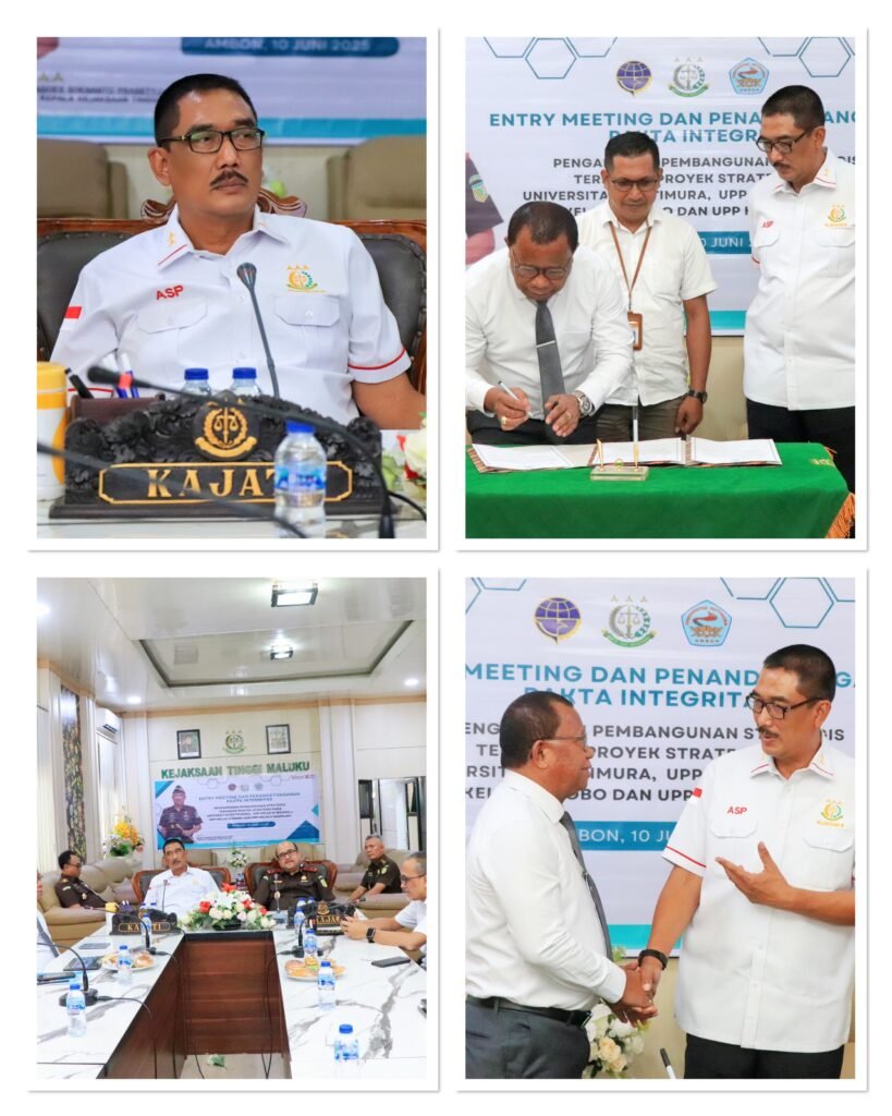 AMBON, Rabu 11 Juni 2025 – VNNMedia – Kepala Kejaksaan Tinggi Maluku Agoes Soenanto Prasetyo, S.H.,M.H bersama jajarannya diruang rapat Kejaksaan Tinggi Maluku, menyelenggarakan Entry Meeting dan Penandatanganan Pakta Integritas bersama Universitas Pattimura Ambon dan Unit Penyelenggara Pelabuhan (UPP) Kelas III Wonreli, Kelas III Dobo dan Kelas II Saumlaki, pada hari ini Selasa (10/06/2025).