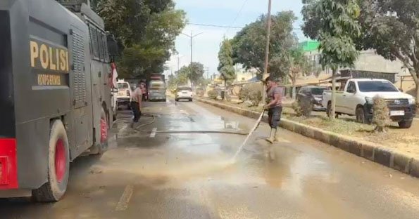 Menyikapi kondisi tersebut, Polri melaksanakan pembersihan serta penyiraman jalan protokol di Kabupaten Aceh Tamiang, Kamis (25/12/2025).