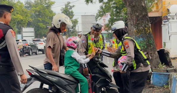 Anggota Satlantas Polres Ponorogo Polda Jatim memberikan cokelat, bunga, hingga helm gratis kepada pengendara yang tertib berlalu lintas.
