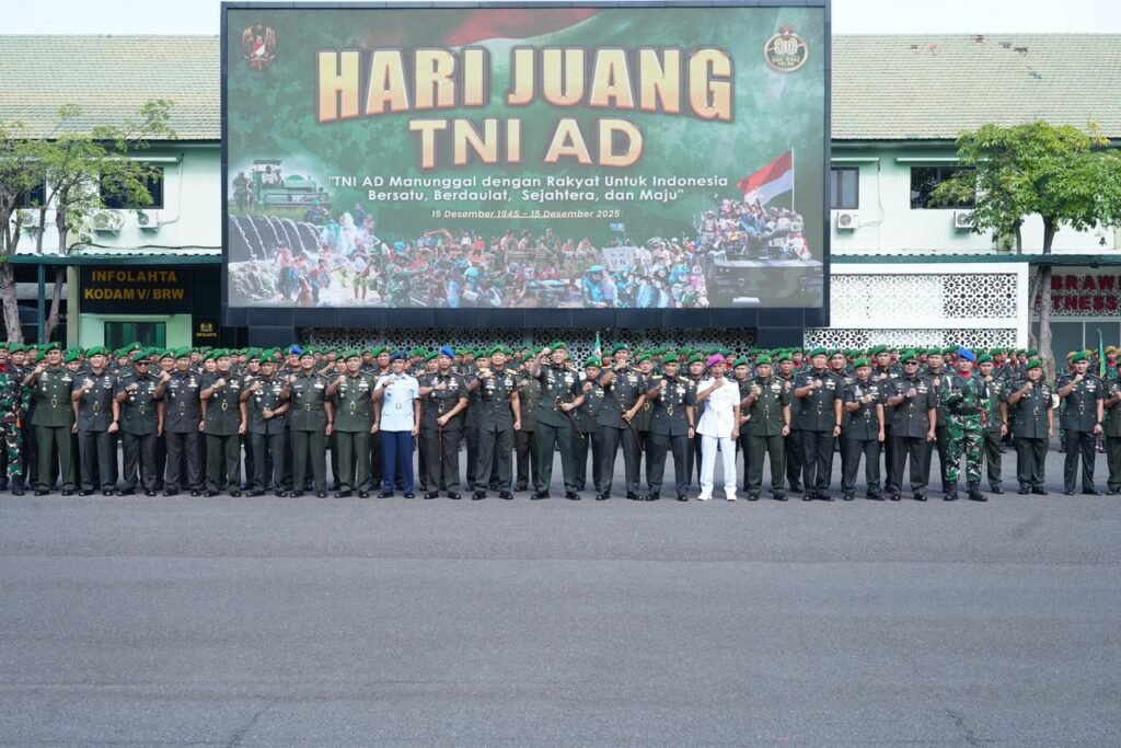 SURABAYA, Senin 15 Desember 2025 – VNNMedia – Pangdam V/Brawijaya Mayjen TNI Rudy Saladin, M.A. memimpin upacara peringatan Hari Juang TNI Angkatan Darat Tahun 2025 di Lapangan Ahmad Yani Makodam V/Brawijaya, Senin (15/12/2025). Kegiatan berlangsung khidmat, mencerminkan semangat pengabdian prajurit kepada bangsa dan negara.
