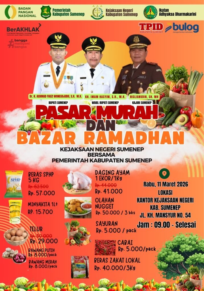 SUMENEP, 11 Maret 2026 – VNNMedia – Pemerintah Kabupaten Sumenep bersama Kejaksaan Negeri Sumenep menggelar Pasar Murah dan Bazar Ramadan guna membantu masyarakat memperoleh bahan pokok dengan harga lebih terjangkau selama bulan suci Ramadan. Kegiatan akan dilaksanakan di Kantor Kejaksaan Negeri Sumenep, Rabu (11/03/2026), mulai pukul 09.00 WIB hingga selesai.