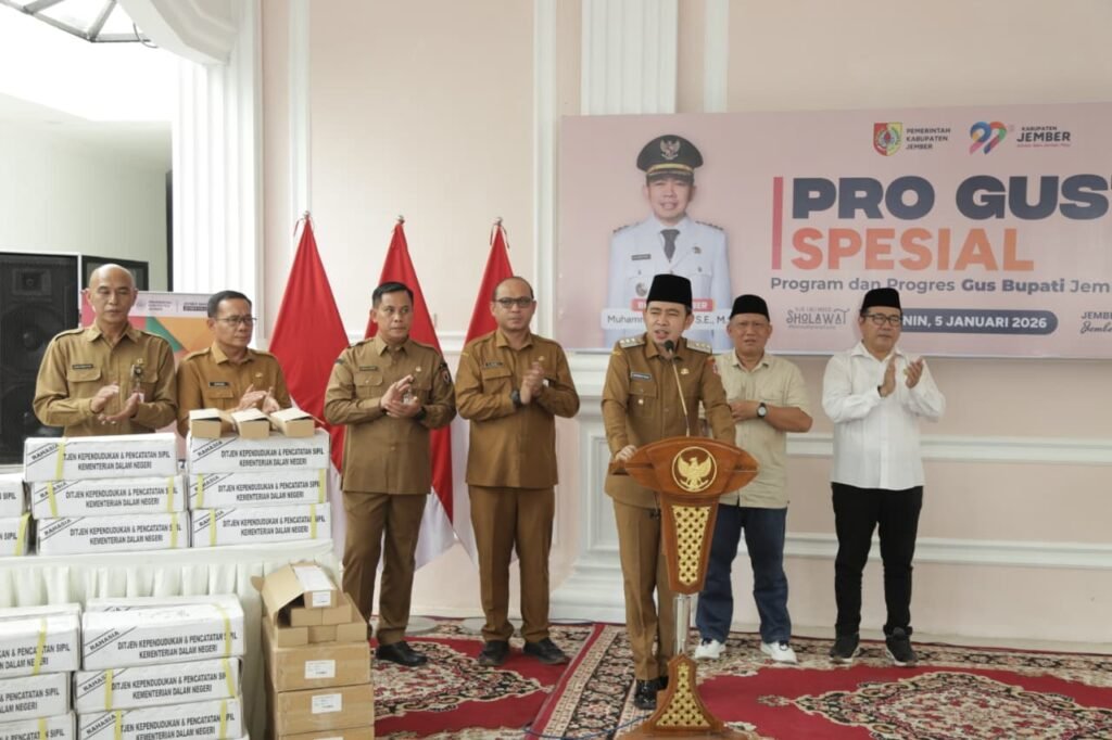 JEMBER, 5 Januari 2026 – VNNMedia – Pemerintah Kabupaten Jember menandai langkah besar di awal tahun 2026 dengan meresmikan Program Peta Cinta (Pelayanan Tuntas Cetak KTP-el di Kecamatan) yang dirangkai dalam agenda Pro Gus’e Update, bertempat di Kantor Kecamatan Jenggawah (05/01/2026). Program ini menjadi tonggak penting pemerataan pelayanan publik, sekaligus jawaban atas persoalan administrasi kependudukan yang selama bertahun-tahun membebani masyarakat Jember, khususnya di wilayah pinggiran.