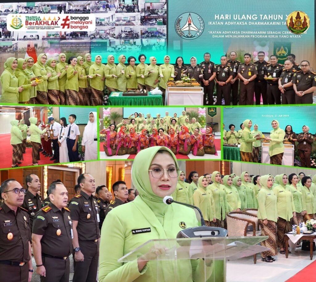 SURABAYA, Selasa 22 Juli 2025 – VNNMedia – Peringatan Hari Ulang Tahun ke-25 Ikatan Adhyaksa Dharmakarini (IAD) tahun ini dilaksanakan secara sederhana namun penuh khidmat. IAD Wilayah Jawa Timur bersama se-Koordinator Surabaya Raya (Surabaya, Tanjung Perak, Sidoarjo, Gresik, Kabupaten Mojokerto dan Kota Mojokerto) melaksanakan acara tasyakuran di Aula Sasana Adhyaksa. Senin, 21 Juli 2025.