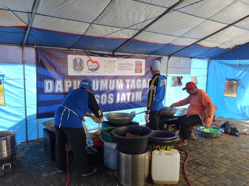Untuk memastikan kelancaran operasional di tengah kondisi darurat, Dinsos Jawa Timur juga mengerahkan peralatan dapur lapangan ke lokasi. Kehadiran peralatan tersebut membantu mempercepat proses memasak dan pendistribusian makanan.