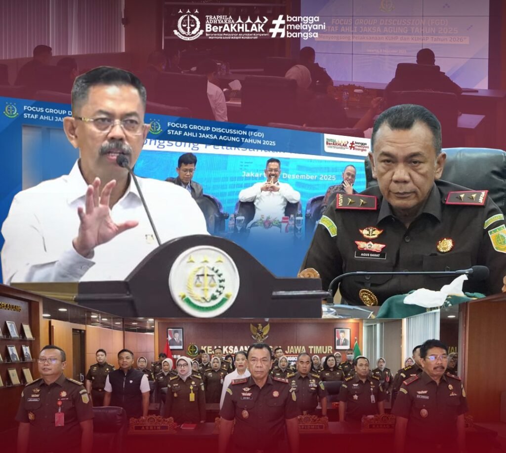SURABAYA, Selasa 09 Desember 2025 – VNNMedia – Kepala Kejaksaan Tinggi Jawa Timur, Agus Sahat ST, S.H., M.H., bersama Wakajati, para Asisten, Koordinator, para Kepala Seksi, serta jaksa fungsional Bidang Tindak Pidana Umum mengikuti Focus Group Discussion (FGD) Staf Ahli Jaksa Agung menyongsong pelaksanaan KUHP dan KUHAP baru Tahun 2026 secara daring dari Ruang Rapat Kejati Jatim, Senin (8/12/2025).