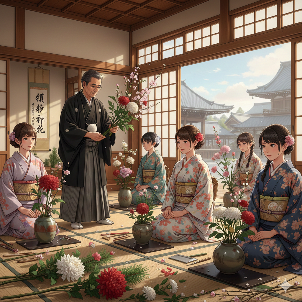 Setelah prosesi di kuil, para siswa berpindah ke sanggar terdekat untuk mempraktikkan keahlian mereka. Di sana, mereka merangkai bunga dengan mendapatkan bimbingan teknis langsung dari Ikenobo Senko, sosok yang diproyeksikan menjadi kepala sekolah berikutnya