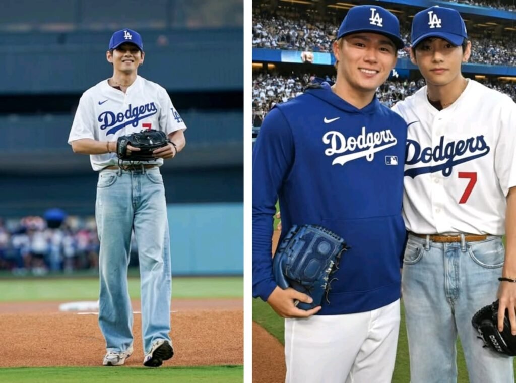 Mengenakan jersey Dodgers dengan nomor punggung 7, V melangkah ke atas gundukan di Stadion Dodger di hadapan ribuan penggemar yang antusias. Setelah sedikit membungkuk hormat kepada pitcher Dodgers, Yoshinobu Yamamoto, V melempar bola dengan tangan kirinya, menandai lemparan seremonial perdananya di pertandingan MLB